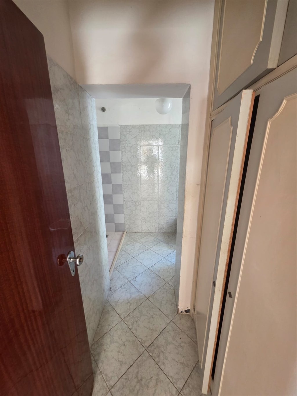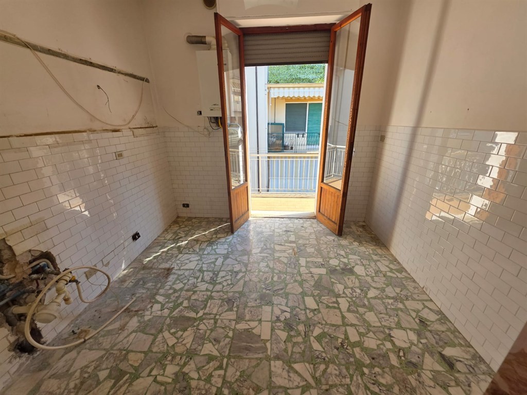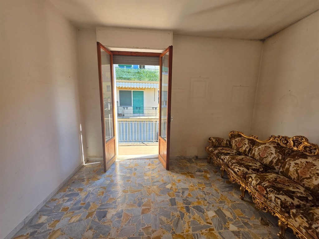 The apartment, in need of renovation, comprises an entrance hall, a living room with balcony, a kitchen with access to the balcony, two spacious bedrooms, and a bathroom. A cellar is also included.