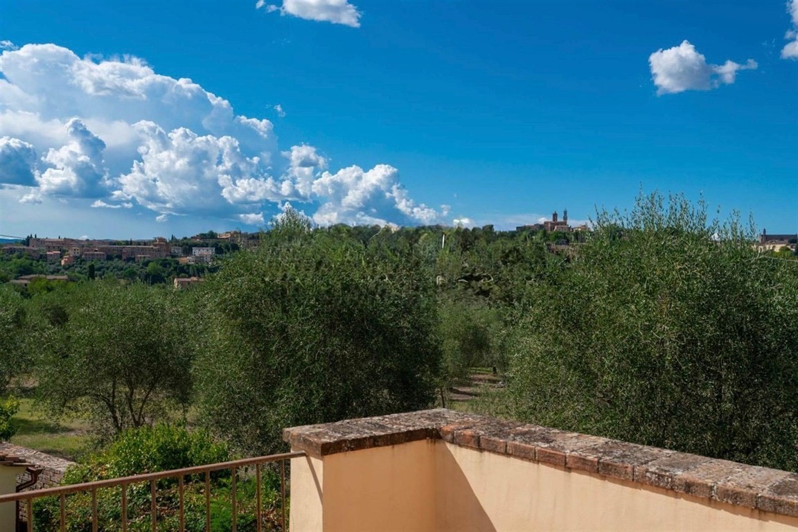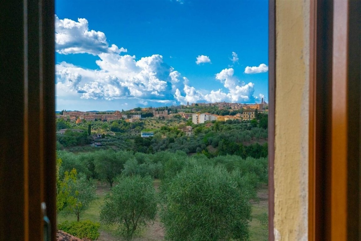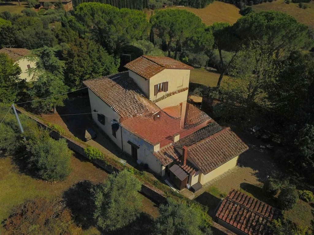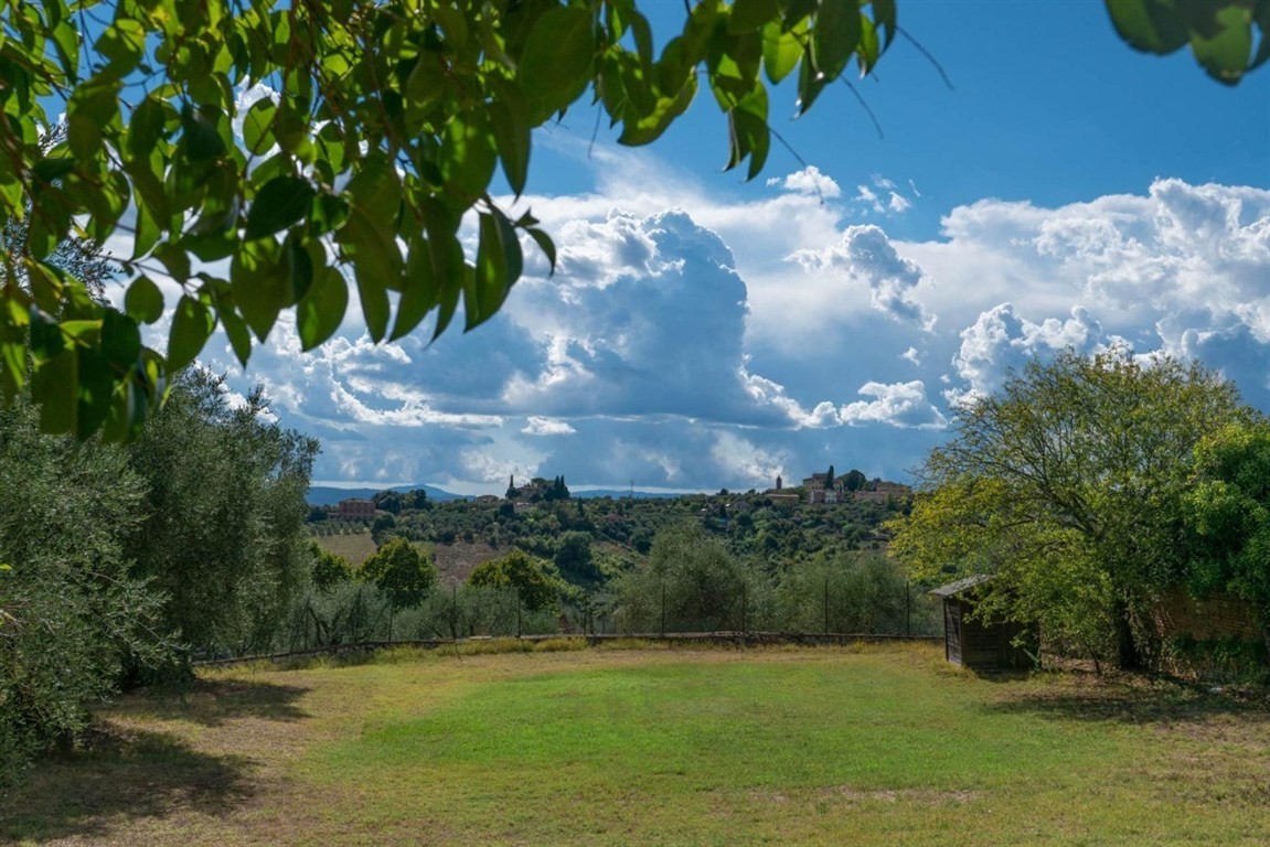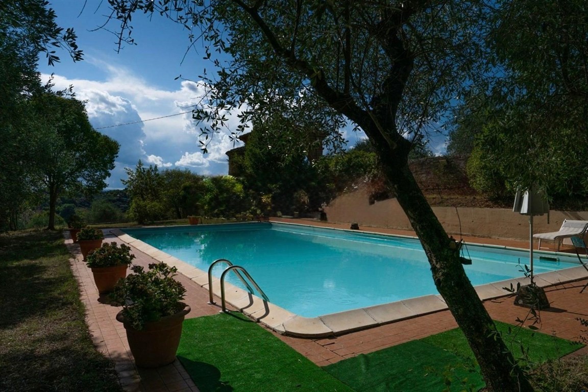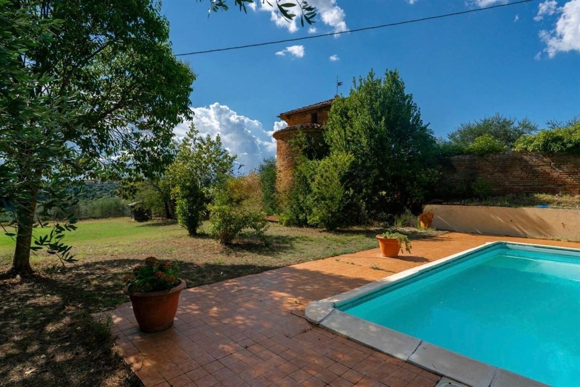 The house is spread over two main levels, plus a tower room that offers breathtaking views of the Sienese hills. The interiors are characterized by exposed wooden beams, terracotta floors, impressive fireplaces, and spacious, light-filled rooms overlooking the garden.