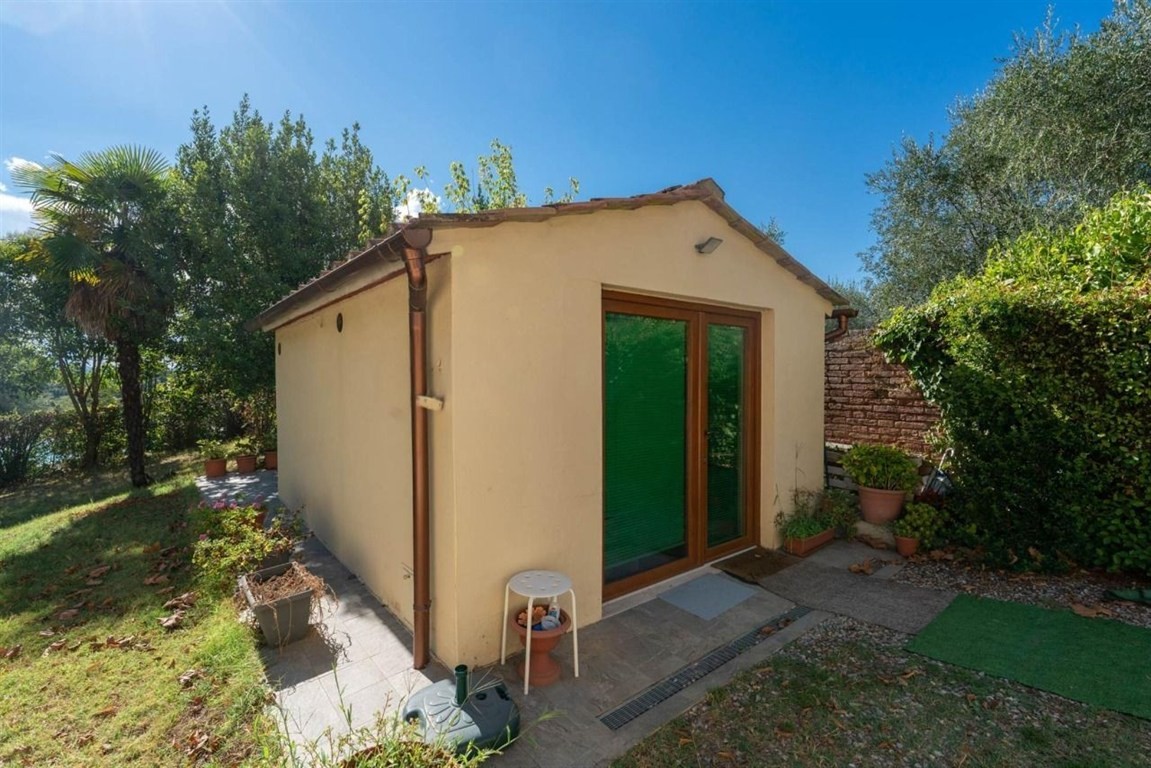 The property is completed by a large private swimming pool of 130 sqm, surrounded by elegant paving, a pool house with shower, a convenient masonry garage of approximately 19 sqm, and a 22 sqm cellar located on the basement level.