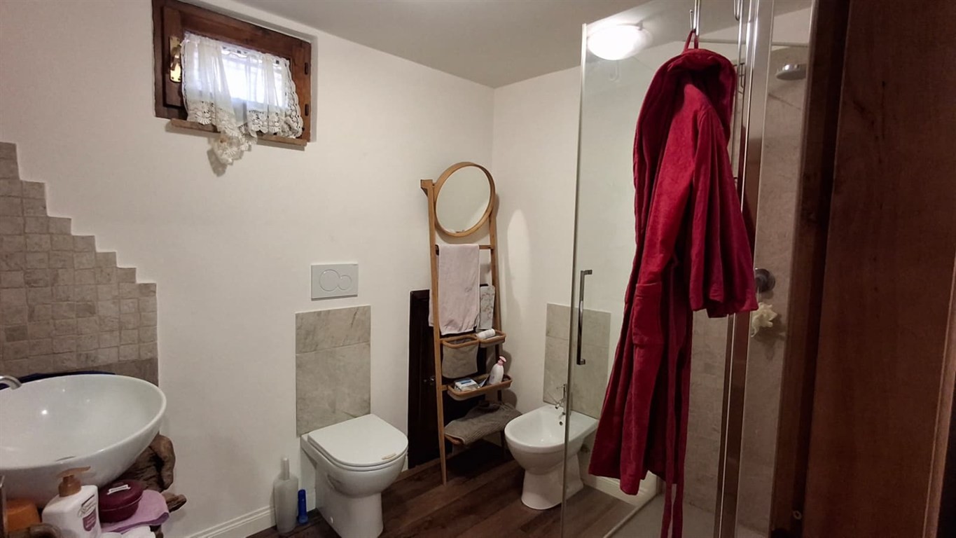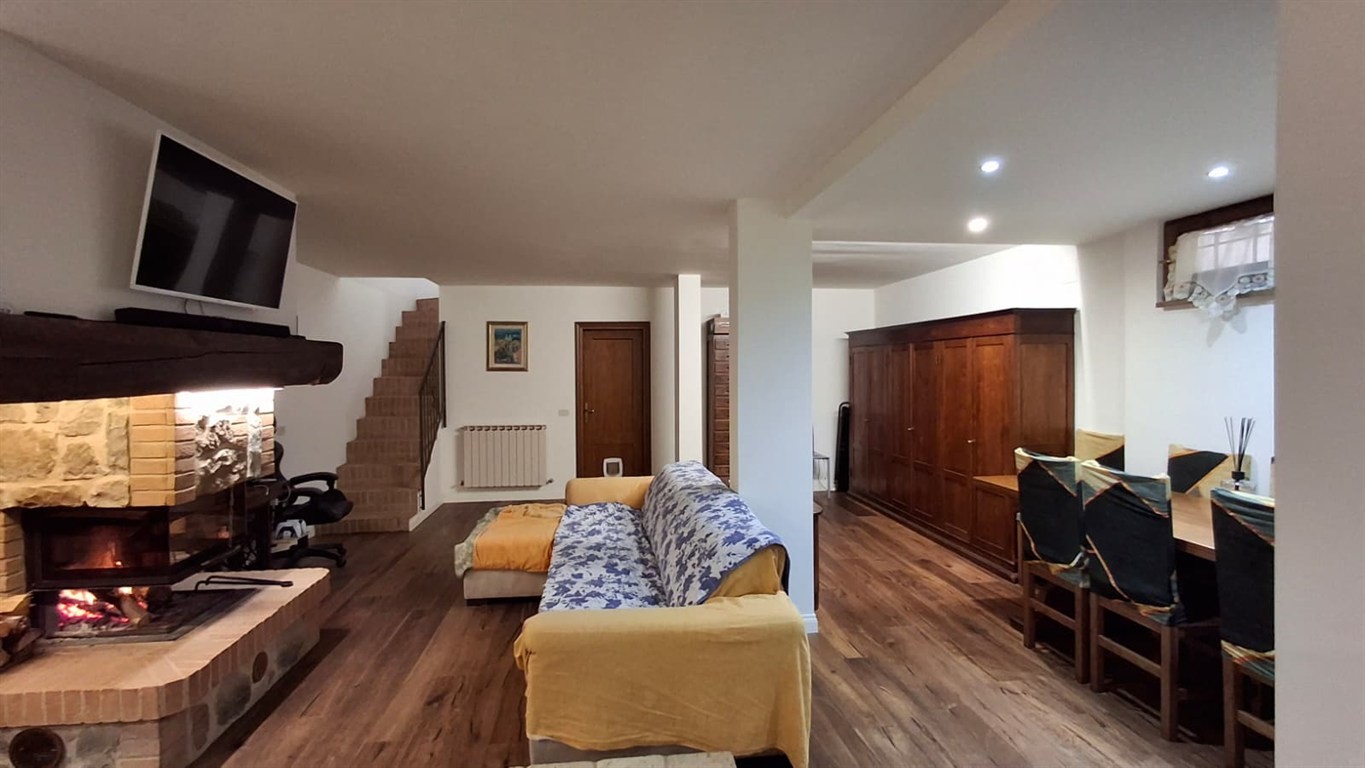 Al piano d’ingresso troviamo un’accogliente zona giorno con accesso diretto al terrazzo e al resede, una camera matrimoniale (anch’essa con uscita sul resede) dotata di guardaroba e bagno (entrambi con finestra); una scala interna conduce al piano sottostante, dove si apre un’ampia taverna adibita a ulteriore zona living e arricchita da termo-camino e cucina attrezzata con piano a induzione, un secondo bagno e un garage collegato internamente (elemento di grande comodità).