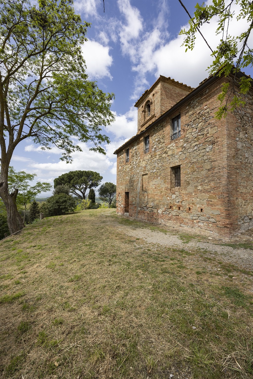 1) Podere situato sulla sommità della collina, dominante l’intero paesaggio circostante, riconducibile alla tipologia dei poderi leopoldini di fine Settecento, si sviluppa attorno a una corte centrale e comprende tre unità abitative, due delle quali parzialmente ristrutturate, oltre a un insieme di annessi agricoli tra cui spicca un fienile storico di grande valore architettonico. La superficie complessiva supera i 1.000 mq, suddivisi tra residenziale e rurale, con ulteriori tettoie e volumi accessori. La posizione, completamente aperta e dominante, garantisce privacy assoluta e un panorama senza eguali. Possibile realizzare piscina, campo da tennis, area elicotteri, scuderia, maneggio e spazi per il pascolo libero dei cavalli.