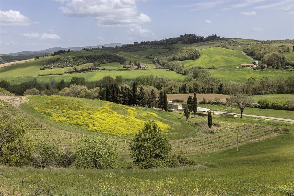 VAL D'ORCIA: NEL PRESTIGIOSO TERRITORIO DI MONTALCINO (SI). Vendesi, in una posizione di assoluto valore paesaggistico e strategico, proprietà agricola di circa 75 ha in corpo unico, adagiata su un’intera collina continua e ininterrotta. La tenuta raggiunge una quota massima di circa 350 metri, corrispondente alla collina più alta della zona, e offre una vista mozzafiato a 360 gradi: Siena a nord, le Crete Senesi a ovest, Montalcino e il Monte Amiata a sud, la Val d’Orcia e Lucignano d’Asso a est.
